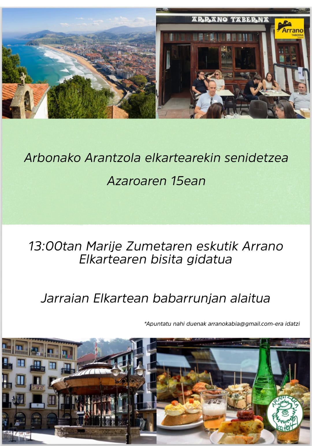 Azaroaren 15ean Arbonako Arantzola elkarteko kideak Zarautza etorriko dira, haien elkartean euskara ikasten duten Biarritz, Ahetze, Arbona, Bidarte, eta Basusarriko zenbait ikaslerekin. Honenbestez, bazkaltzeko bestelako erreserbarik ezingo da egin egun horretan.